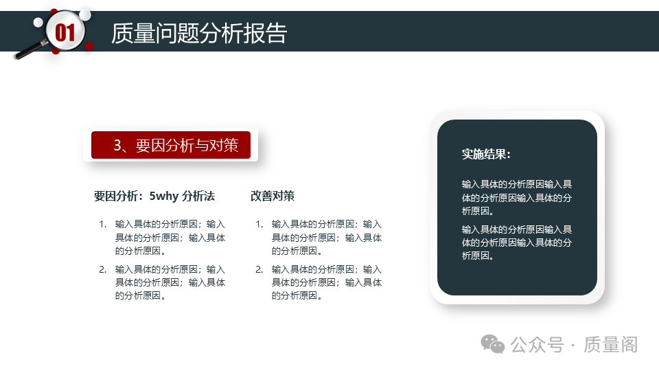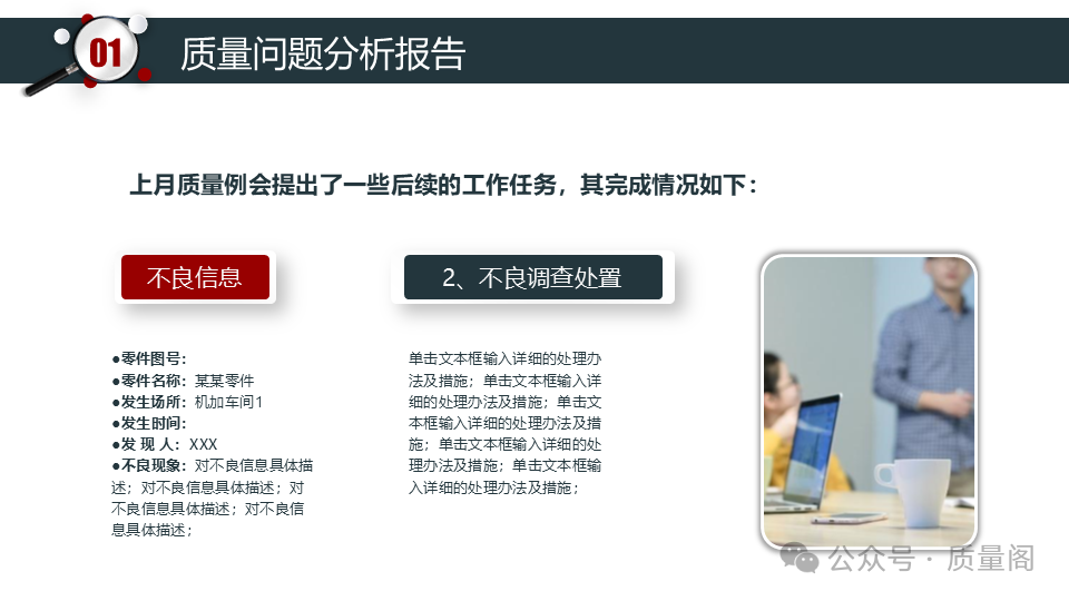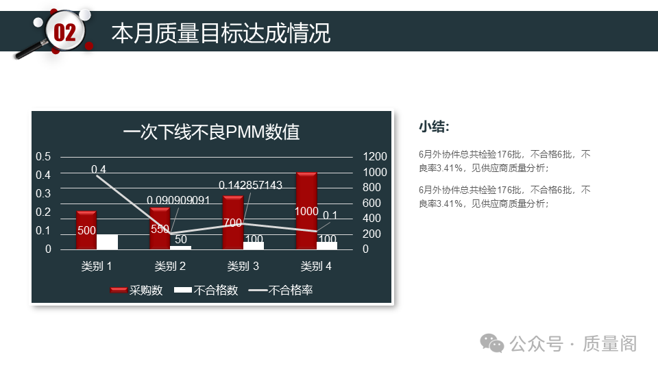 在上次月度质量例会上,我们针对前一月的质量问题进行了全面梳理,并制定了针对性的改进措施。这些措施包括但不限于优化生产流程、加强员工技能培训、完善质量检测体系、强化供应商管理等。经过一个月的努力,这些措施的实施效果如何?是否达到了预期目标?- 生产流程优化:通过对生产流程的细致梳理,我们识别并解决了多个瓶颈环节,生产效率显著提升。同时,我们引入了先进的生产设备和技术,进一步提高了生产线的自动化和智能化水平。这些措施的实施,使得产品的一次性合格率从XX%提升至XX%,有效降低了不良品率。